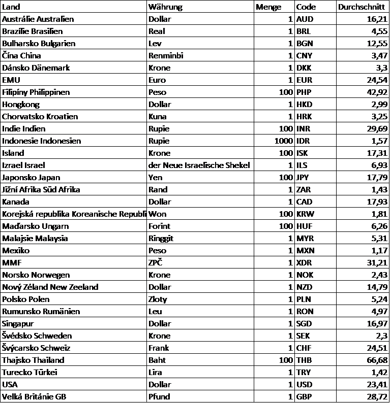 Die einheitlichen Wechselkurse in der von der Tschechischen Nationalbank (ČNB) veröffentlichten Wechselkursliste umfasst folgende Währungen: