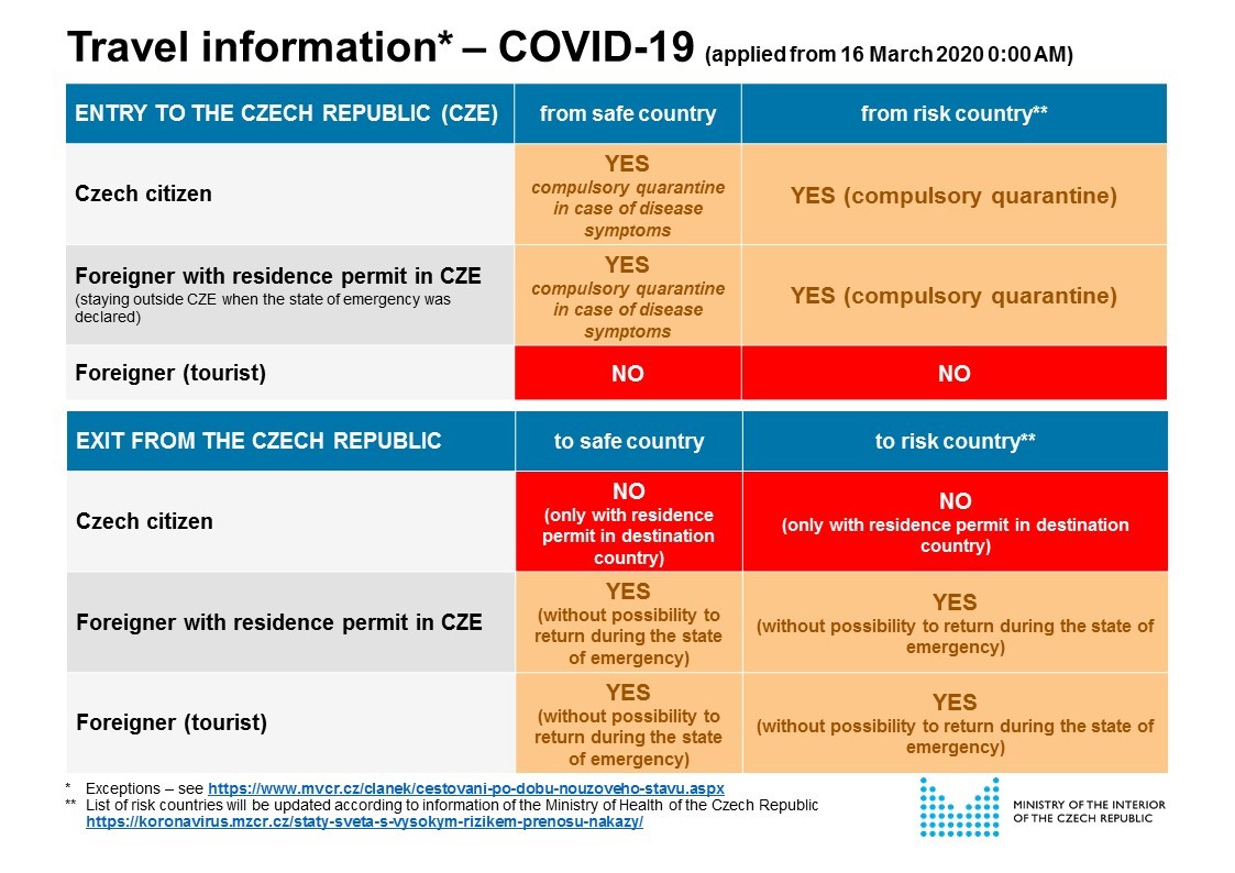 - Foreigners – holders of temporary residence permit (long-term visa, long-term residence, permanent residence) who were staying outside of the Czech Republic at the time of the emergency state declaration are allowed to return to the Czech Republic. However, at the border crossing, they must undergo a medical check-up and, in case of disease symptoms, they will be subject to a 14-day quarantine, and if a foreigner is returning from a risk country (see the list below), then this quarantine is ordered automatically. This regime will probably also apply to foreigners who have been granted a residence permit but have not yet arrived in the Czech Republic.